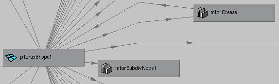 Notice that the sole input into mtorSubdivNode1 comes from pTorusShape1. This connection represents the polygon mesh data. If you wish to modify visualization controls, you should select the mtorSubdivNode1 node and then either turn your attention to the Maya Channel box or invoke the Attribute Editor window.