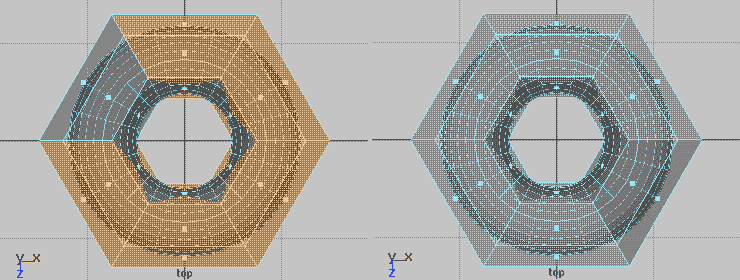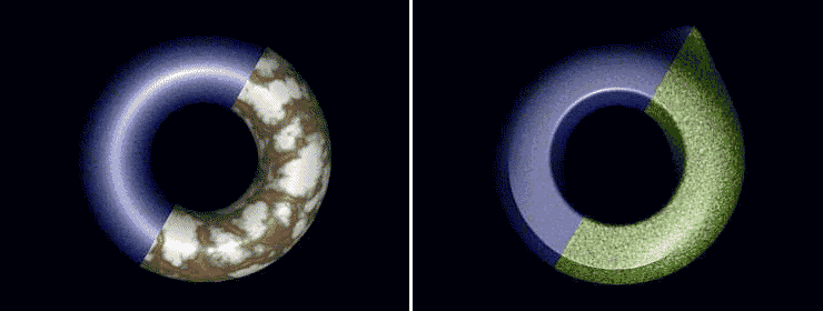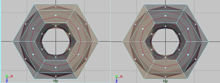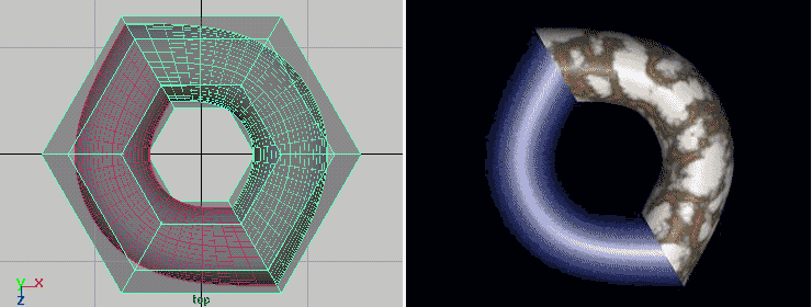 In the images above we notice that our mild-mannered torus has undergone major reconstructive surgery. And, while we're most greatful to the surgeon, it's probably not exactly what we expected. While our surface is now continuous, exhibiting no unsightly holes, it's lost its pleasantly curvacious qualities. In techie-jargon, its tangents are no longer continuously varying. In some situations, this result may be desireable and that is precisely why we've provided the Mtor Subdiv Interp flag. However, when you feel seduced by smooth curves, you must press on: